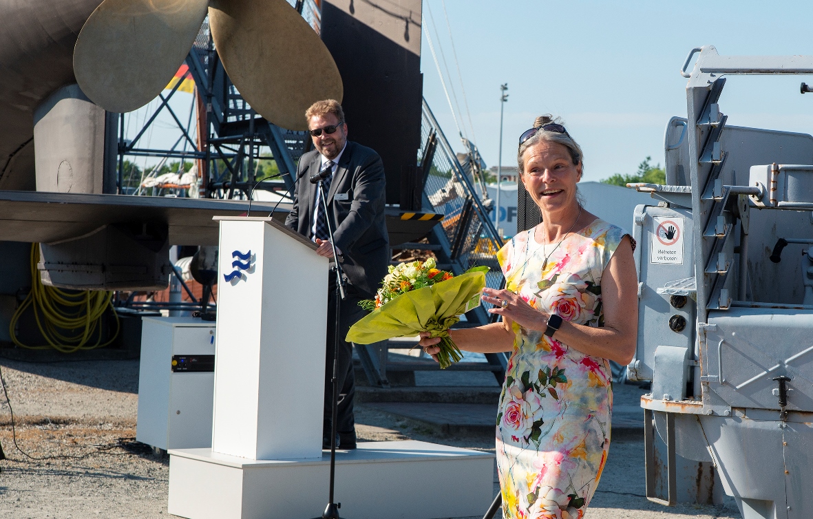 Letzter offizieller Auftritt einer langjährigen Gefährtin im Deutschen Marinemuseum: Unter der Leitung von Frau Dr. Schormann, die ab Herbst ein neues Amt antritt, förderte die Niedersächsische Sparkassenstiftung zahlreiche Projekte des Marinemuseums. Im Hintergrund Museumsleiter Dr. Stephan Huck (Foto: Deutsches Marinemuseum / Torsten Wieland)