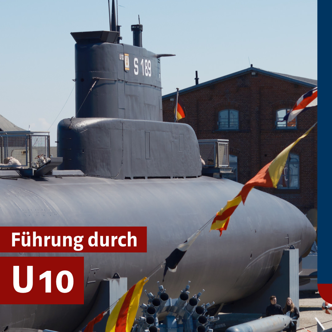 Sie setzen sich mit dem Schicksal eines Kleinst-U-Bootes der Kriegsmarine auseinander, bekommen die Folgen der Versenkung des Passagierdampfers LUSITANIA 1915 erläutert und erfahren, welche Rolle die Enigma-Schlüsselmaschine im Zweiten Weltkrieg spielte. Den Höhepunkt der Führung bildet dann die Besichtigung des U-Bootes U10 im Freigelände, in dem der Bordalltag unmittelbar erfahrbar wird.