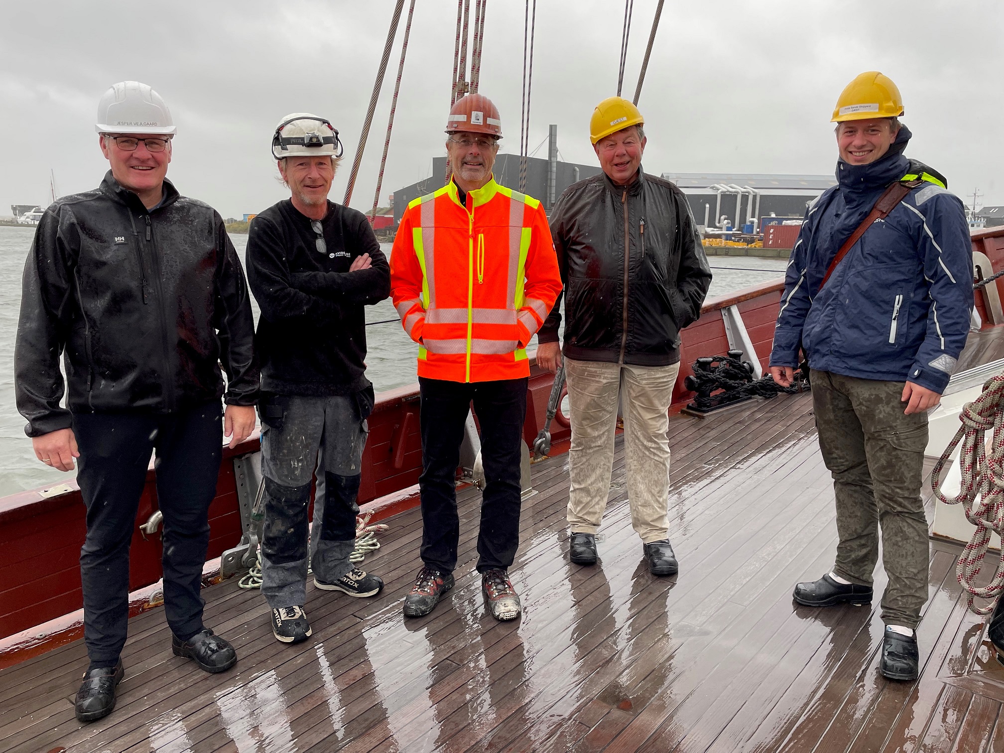 Jesper Vejlgaard, Olaf Wunderlich (beide Hvide Sande Shipyard), Detlev Loell (Büro Detlev Loell), Konteradmiral a.D. Gottfried Hoch (Stiftung Deutsches Marinemuseum) und Matthäus Schwaderlapp (Büro Detlev Loell) an Bord der Nordwind am derzeitigen Liegeplatz in Hvide Sande, Dänemark